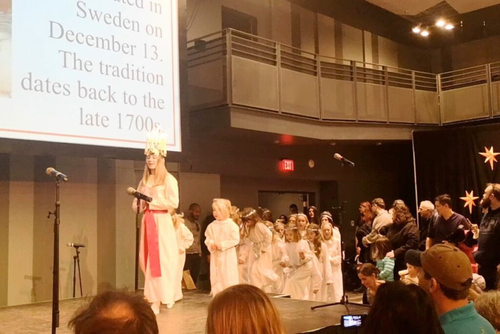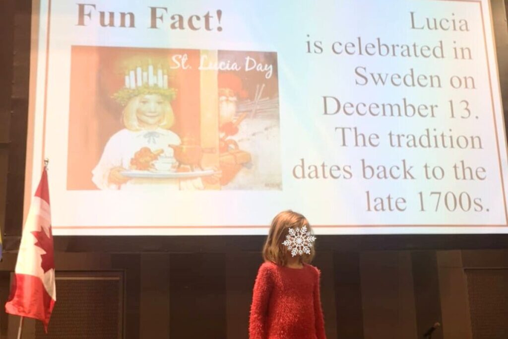 I grew up singing in a Lucia choir connected to the Swedish community of Toronto, and we sang Swedish Christmas songs, and carried candles. One girl selected as the Lucia wore a crown of candles on her head.