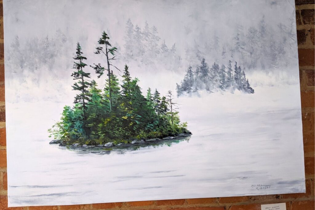 This painting for example is of the Muskoka region painted by Richard Robinson, and shows the trees and islands very common for that area.